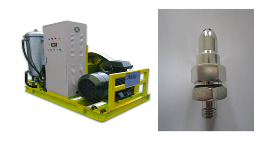 高壓射流清洗:是使用高壓泵打出高壓水,并經(jīng)過(guò)一定管路到達(dá)噴嘴,再把高壓力低流速的水轉(zhuǎn)換為高壓力高流速的射流,然后射流以其很高的沖擊動(dòng)能,連續(xù)不斷地作用在被清洗表面,從而使垢物脫落,最終實(shí)現(xiàn)清洗目的。
